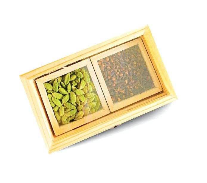 An exclusive wooden box containing Green cardamom from Idukki and Golden brown cloves from Wayanad.