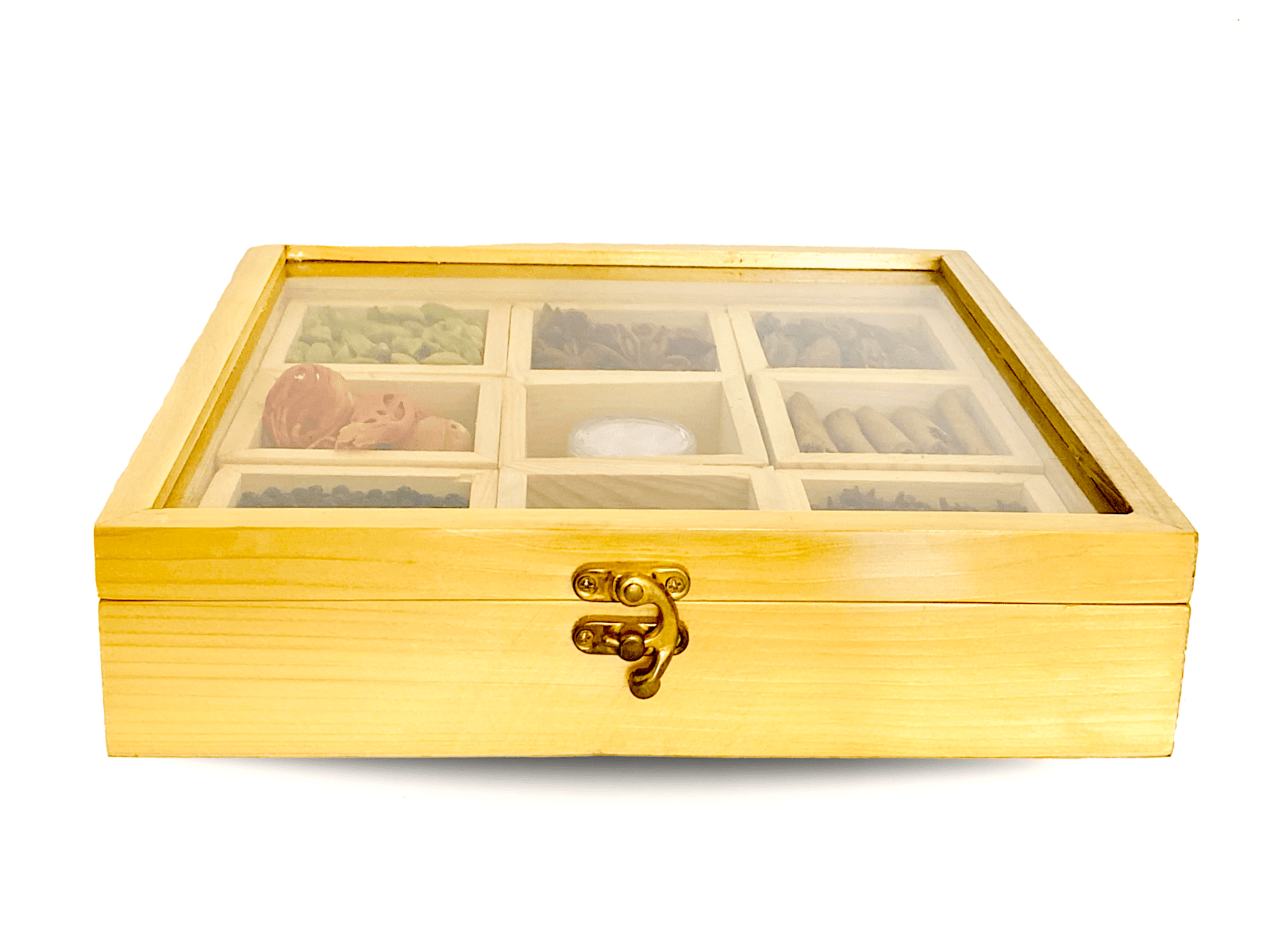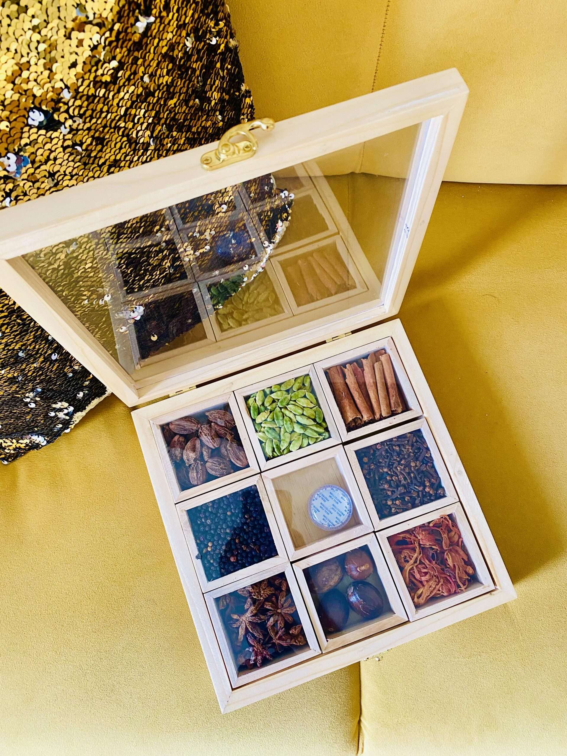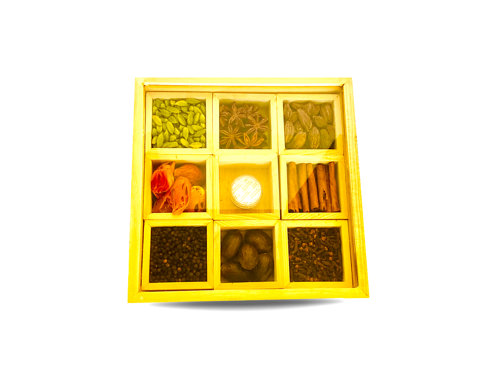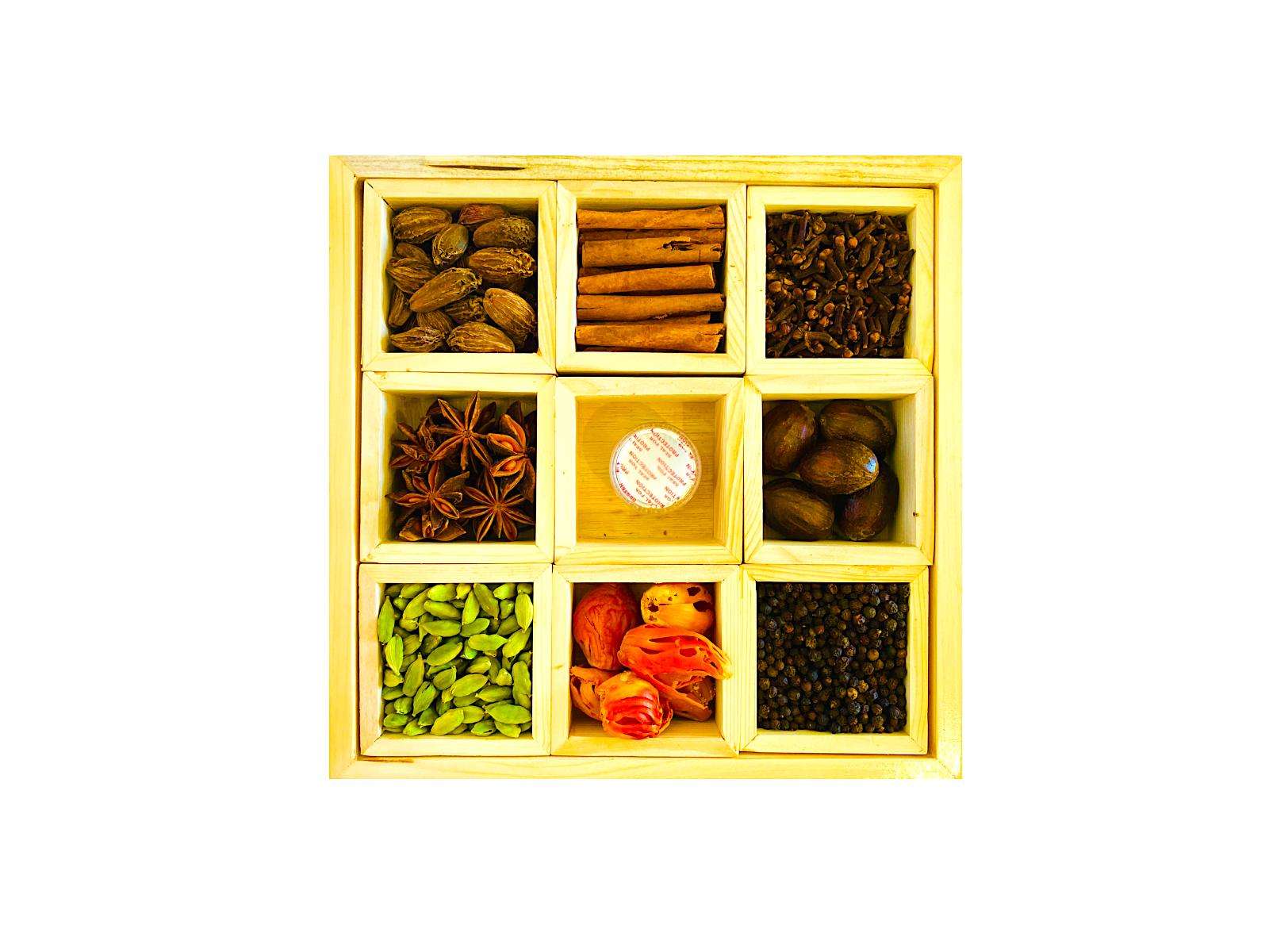 Black Cardamom 50g I Black Pepper Whole 50g I Cardamom 50g I Cloves 50g I Original Cinnamon 25g I Mace 25g I Nutmeg 25g I Saffron 1g I Star Anise 50g.